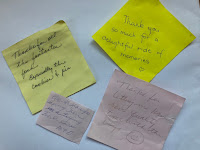 it all started years ago. one of my sisters and her family were able to come home from their mission field bout every 2 years, usually for a number of months. during that time they would stay with our folks for a bit. just before leaving, she would leave Post-It notes in various places for Mom and Dad to find later. for example, in Mom's huge bucket of laundry soap she would dig down and place a note that would thank her for all the laundry she did. it soon morphed into an entire extended family tradition that we renamed from Post-It notes, to sticky notes.